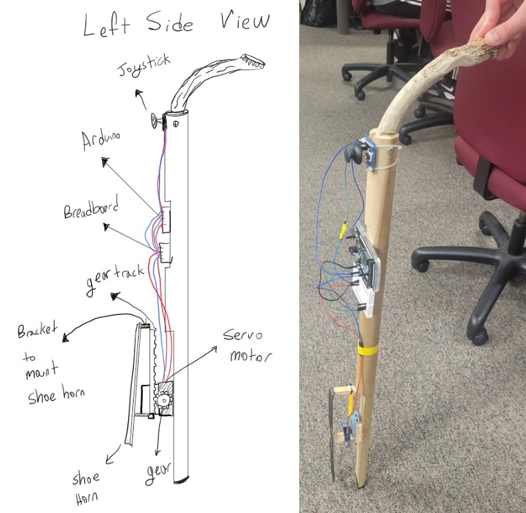 Cane-based assistive device for elderly users combining walking support with a retractable shoehorn controlled via joystick.